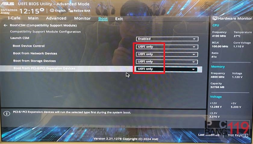 7. [Laurch CSM]에서 [Enter] 해 아래 그림 처럼 실행[Enabled]를 선택하여 주세요.
