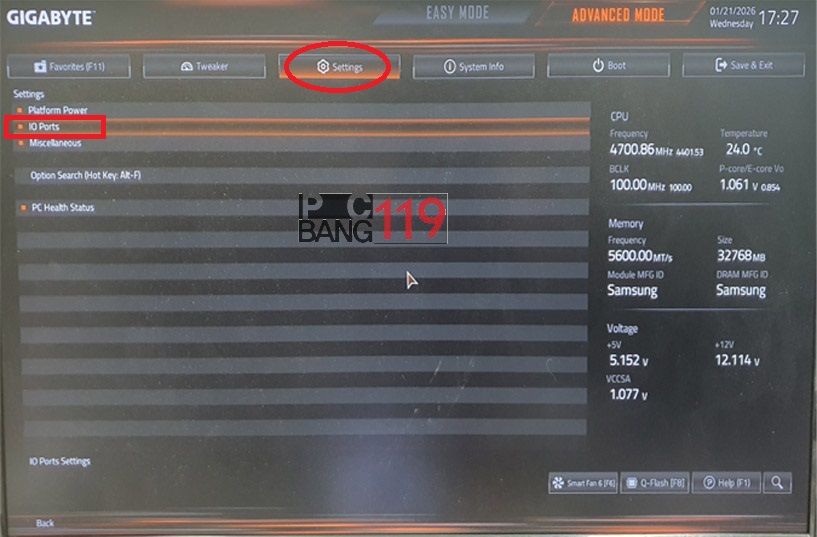 3. 메뉴 상단 3번째 [Setting]에 아래 메뉴중 2번째 [IO Ports]을 선택하여 [Enter] 해 주세요.