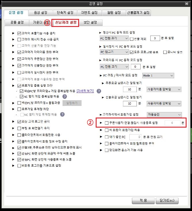 2. 아래와 같이 [손님자리 설정] 에서 [쿠폰사용자 연결~] 앞에 체크를 지워 주세요.
