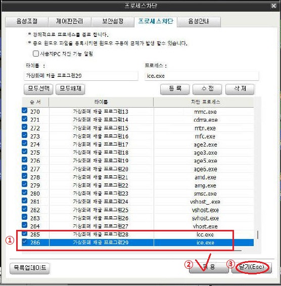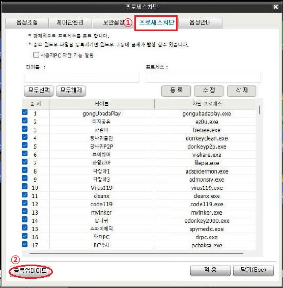 3. 프로세스 차단 창에서 오른쪽 아래 [목록업데이트] 클릭해 실행 해주세요.