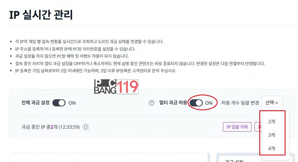 2. NC 피씨방 사이트에서 접속하여 [PC방관리] > [IP 실시간 관리] 접속해서 보시면 아래와 같이 멀티 과금 허용이 Off 되 있습니다.
