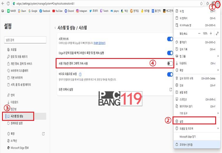 2. 아래와 같이 엣지 사용자 엣지 하드웨어 가속기를 꺼주세요