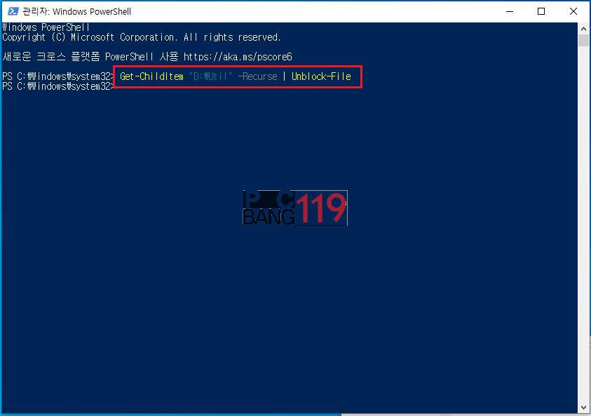 파일 용량에 따라.. 시간이 다소 걸릴수 있습니다. Get-ChildItem "D:\Util" -Recurse chr(124)_pipe Unblock-File